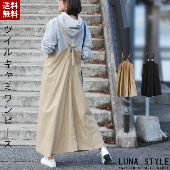 【メール便送料無料】※代引き不可 ワンピース キャミワンピース ロングワンピース キャミソール ジャンパースカート リボン 綿ツイル フレア ゆったり オーバーサイズ マキシワンピース スカート フレア ロング丈 無地 レディース 春 夏 28940